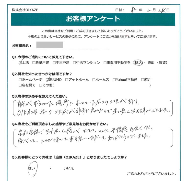 自分が求めていた場所に求めていた広さの土地があり、OIKAZE様のご対応が非常に良かったので迷い無く決める事ができました。