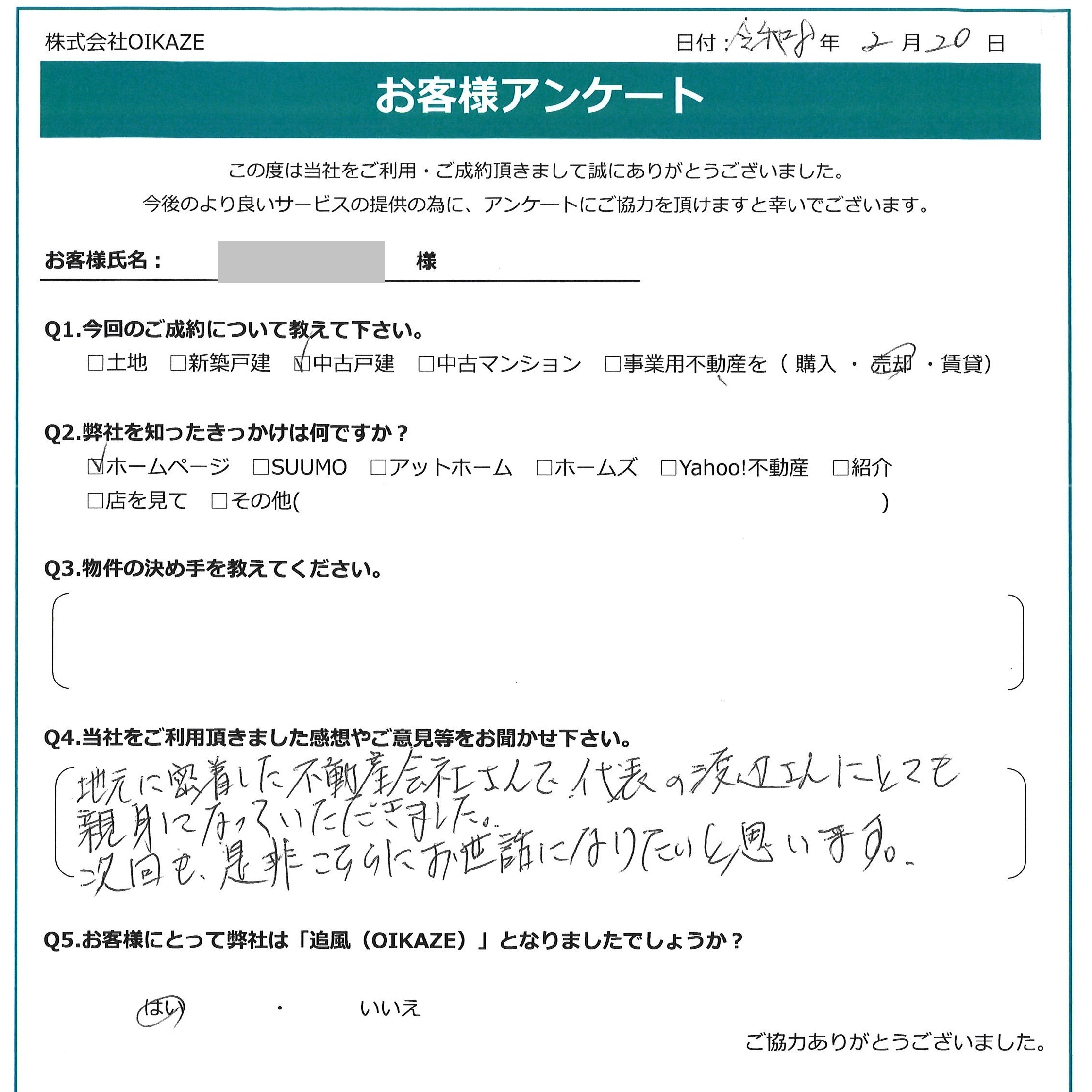 【2026年2月ご成約】埼玉県川越市の中古戸建をご売却のA様 2026.02.21中古戸建, 渡辺健太, 立柳佑基【2026年2月ご成約】埼玉県川越市の中古戸建をご売却のA様 【2026年2月ご成約】埼玉県川越市の中古戸建をご売却のA様【2026年2月ご成約】埼玉県川越市の中古戸建をご売却のA様 お客様から頂いたアンケート 今回のご成約について教えて下さい。 中古戸建を売却。 弊社を知ったきっかけは何ですか? ホームページ。 当社をご利用頂きました感想やご意見等をお聞かせ下さい。 地元に密着した不動産会社さんで、代表の渡辺さんにとても親身になっていただきました。 次回も是非こちらにお世話になりたいと思います。 お客様にとって弊社は「追風(OIKAZE)」となりましたでしょうか? はい。 担当はこんな人!