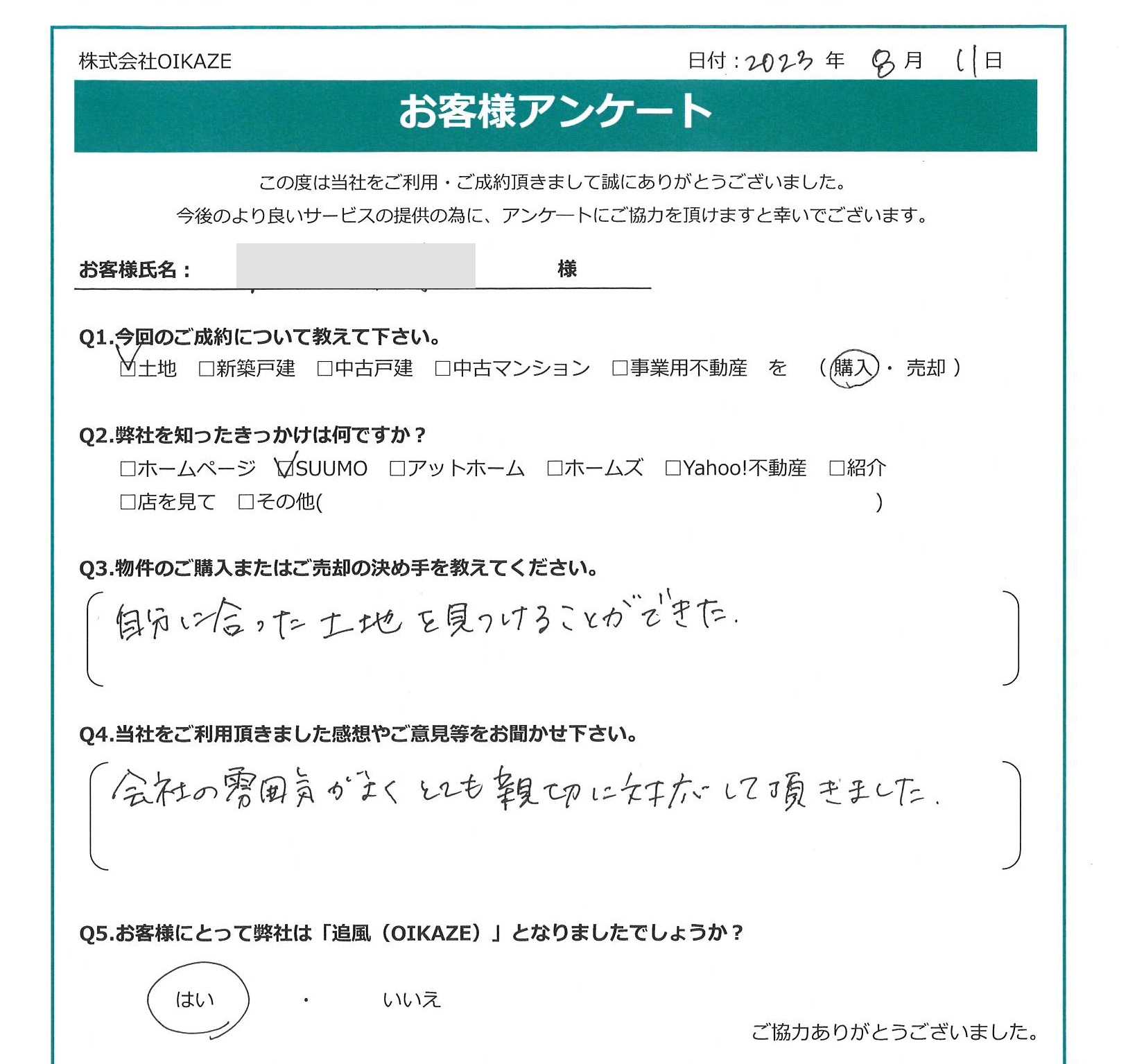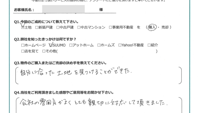 【2023年8月ご成約】埼玉県川越市の土地をご購入のⅠ様 2023.08.14土地, 渡辺健太 【2023年8月ご成約】埼玉県川越市の土地をご購入のⅠ様 お客様のアンケート 今回のご成約について教えて下さい。土地を購入弊社を知ったきっかけは何ですか?SUUMO物件のご購入の決め手を教えてください。自分に合った土地を見つけることができた。当社をご利用頂きました感想やご意見等をお聞かせ下さい。会社の雰囲気がよく、とても親切に対応して頂きました。お客様にとって弊社は「追風(OIKAZE)」となりましたでしょうか?はい。