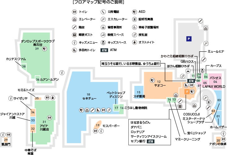 店舗は、南古谷、川越、上里、伊奈、秩父、鴻巣、吉川、浦和美園と埼玉県に8つもあります。その他にも千葉の成田、野田、群馬の高崎にもあるそうで、その近隣周辺の住民の日々の生活に役立っているショッピングモールです。