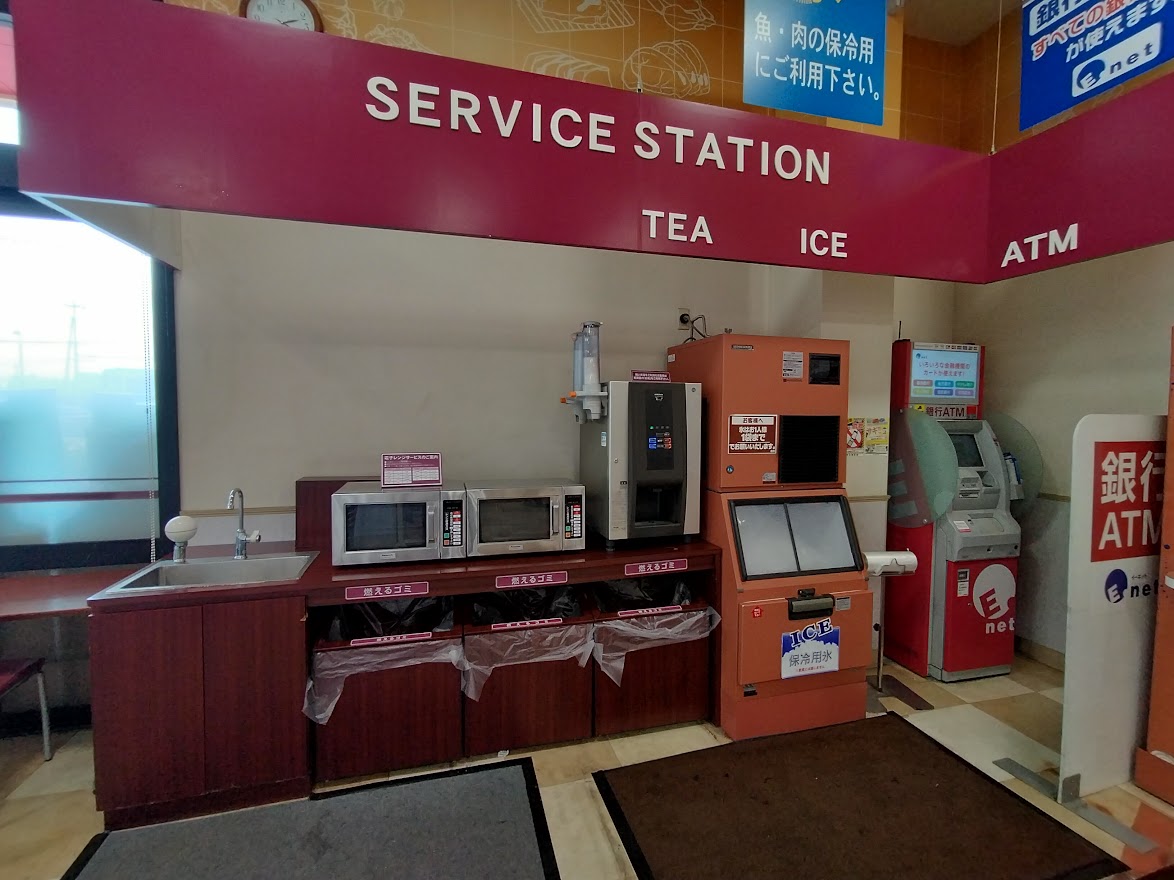 イートインコーナー内のサービスステーションには、電子レンジや給水機、手洗い場や保冷用の氷などもあります。