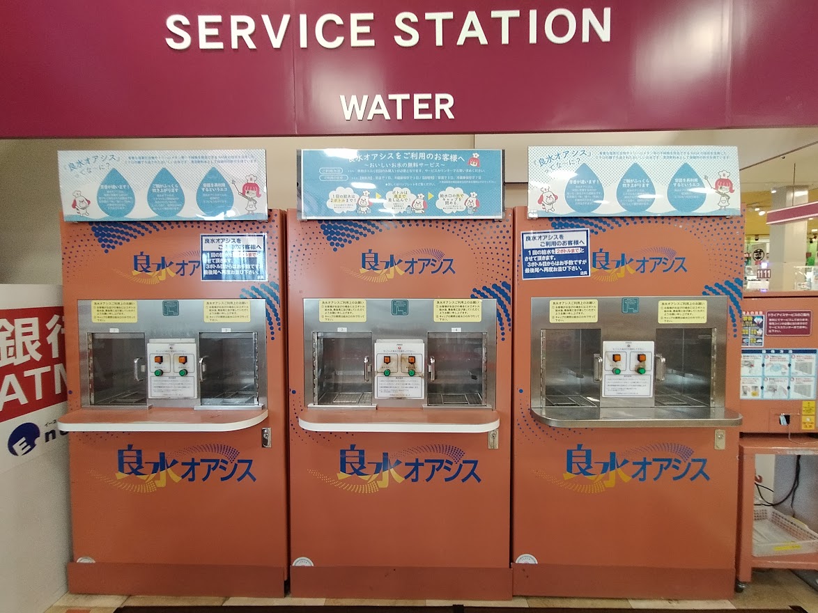 おいしいお水の無料サービス「良水オアシス」。お水をご家庭に持ち帰れるサービスもあります。専用のボトルを購入すればいつでも無料でお水を持ち帰る事が出来ます。