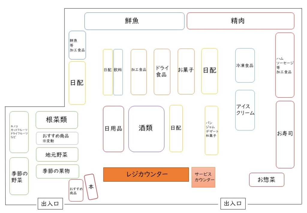 店長の三田様にお話しを伺ったところ、地域の常連様の為によく購入してくれるものが欠品しない努力や、年配の方や足の不自由な高齢者の方が快適にお買い物が出来る様に前述したような様々な工夫をされているとのこと。常連様を大切にし、また快適にお買い物をして頂きたいという気持ちが伝わり、「心のこもった店舗だな」という印象を受けました。
