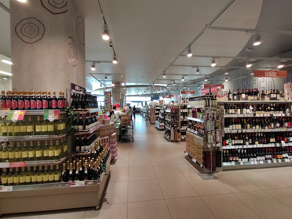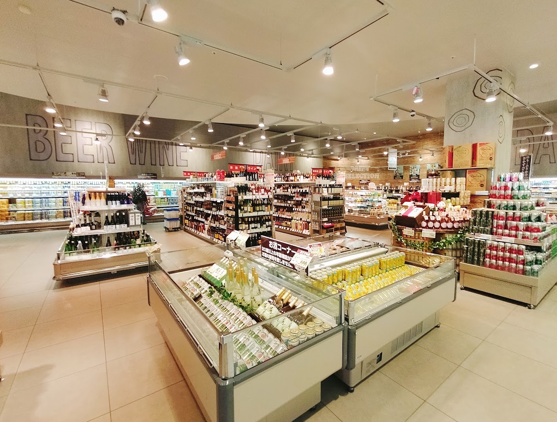 川越南古谷店のお酒コーナーは選びきれないほどの沢山の種類お酒が綺麗に並んでいます。