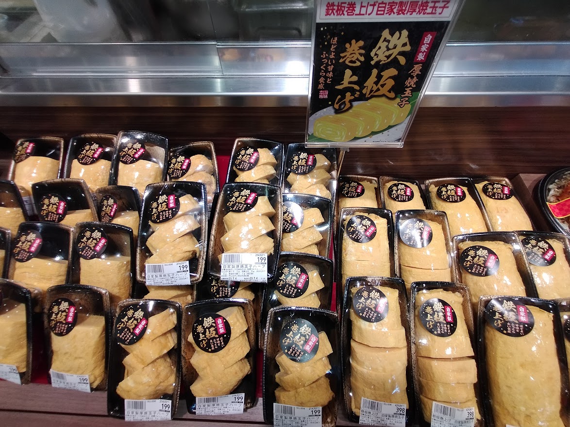 人気商品の卵焼きは程よい甘みとふっくら食感。ヤオコーオリジナルの鉄板で巻き上げた自家製厚焼き玉子。