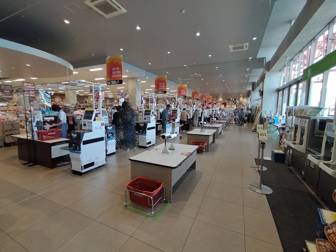 川越南古谷店ではレジの台数も多く、レジはセルフ生産レジとなっています。精算のみがセルフとなっており、混雑時の軽減が解消されるように工夫されていました。