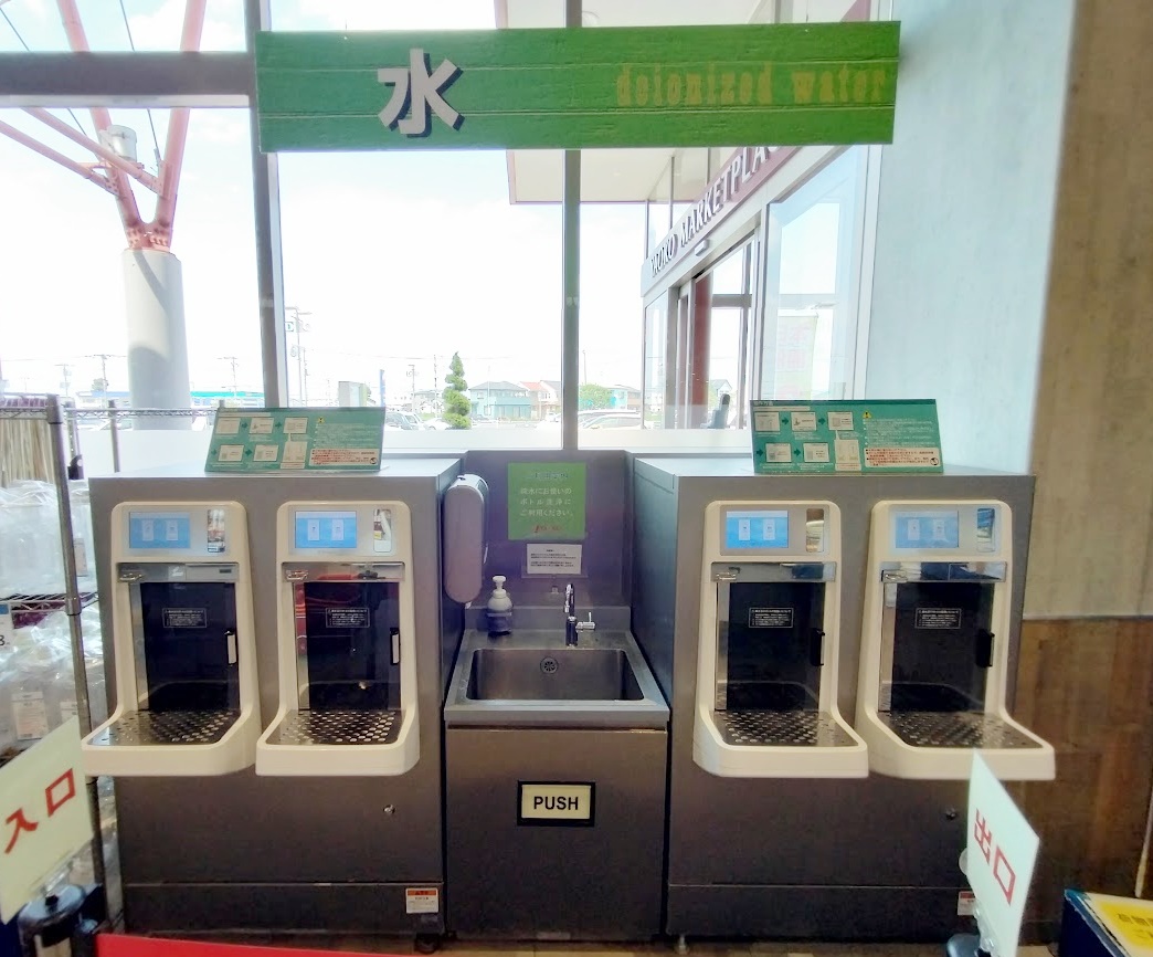 店内には無料のお水のサービスがあります。ヤオコーのお水は、水道水を1000万分の1ミリの穴をもつフィルターでろ過し、不純物を取り除いたお水です。