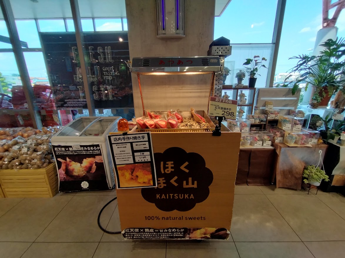青果コーナ横では焼き芋を販売しています。店内手作りで季節問わず1年中販売しています。