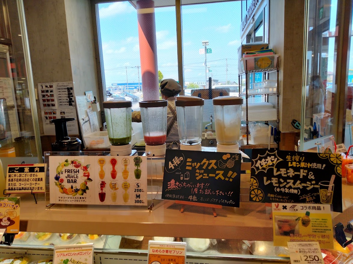 その場でフルーツをミキサーでフレッシュジュースにしてくれる「フレッシュジュースバー」にてお好きなフルーツの組み合わせでジュースを作ってくれます。またおすすめの組み合わせなども提示してあります。